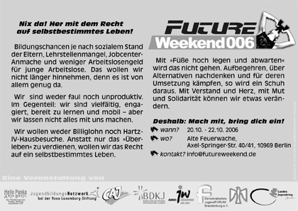 initiiert vom bundesweiten „Netzwerk Grundeinkommen“ ist das FutureWeekend eine Veranstaltung von und für junge Menschen zu den Themen Wandel der Arbeitswelt, Stellung von Erwerbsarbeit, Arbeitszeitverkürzung und Grundeinkommen zur Information und Weiterbildung der Teilnehmer/-innen als auch zur Intervention in den öffentlichen Diskurs.